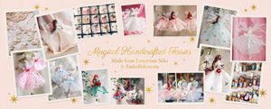 Our fairies are created with the softest, spellbound silks and adorned with twinkling, tiny glass-beaded tiaras. Every detail is magical, from their delicate handmade slippers to the vintage ribbons, sourced from the charming haberdasheries of Paris. Their fabric flowers, once adorning royal dresses, add an extra layer of history and charm.
