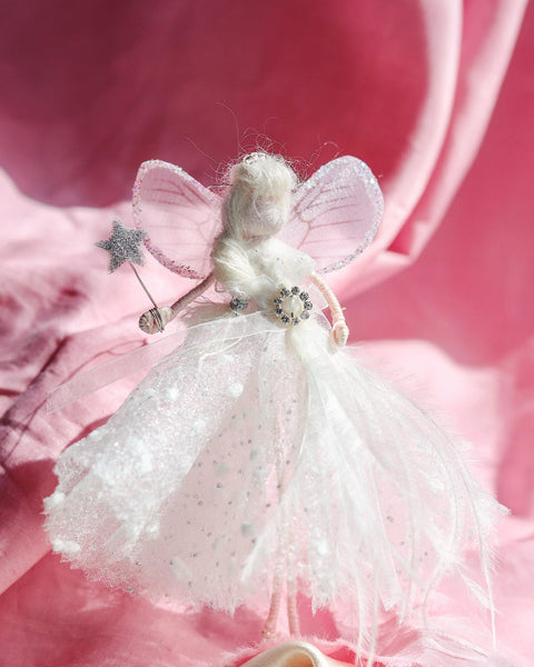 This Fairy is a One-of-a-Kind, Handcrafted Heirloom. Handmade by a talented bridal designer using her most cherished fabrics, this fairy is a truly unique piece, designed to be treasured as a special family heirloom. No two fairies are exactly alike, as each is carefully crafted by hand.